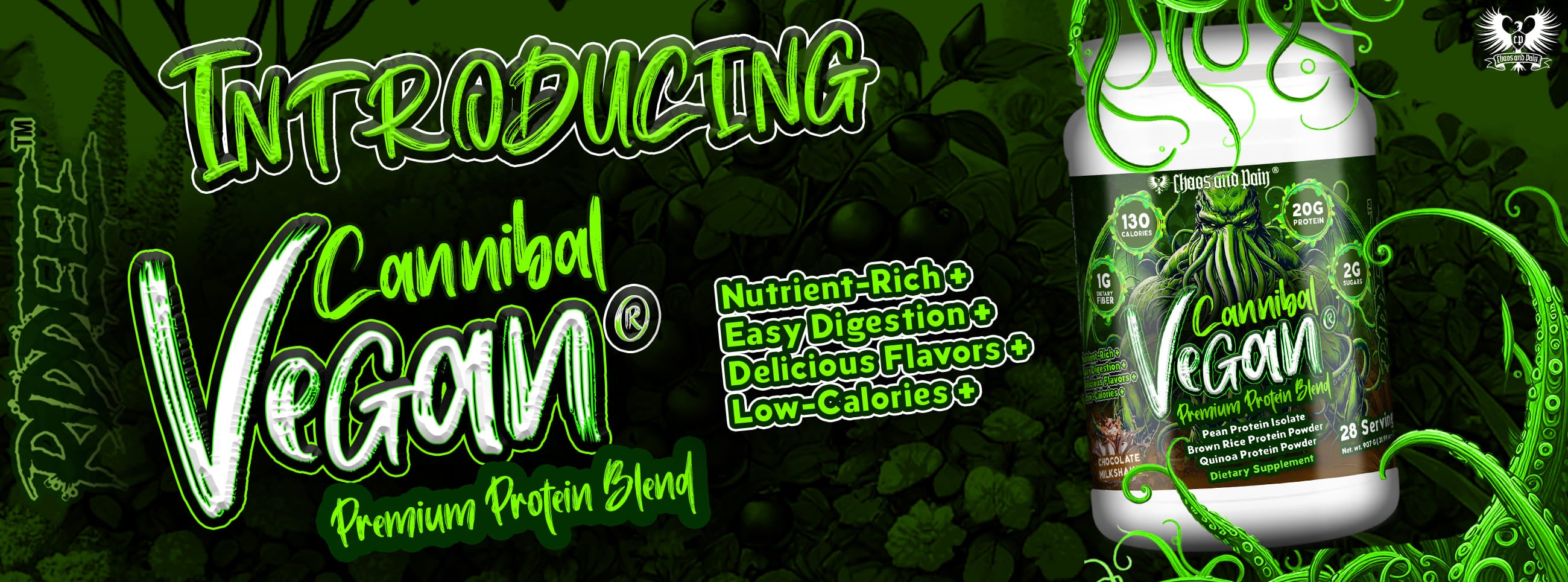 Cannibal Vegan® Protein stands out with its superior blend of plant-based proteins, healthy fats, and antioxidants, delivering a complete nutritional profile to support your fitness and health goals. Trust in Chaos and Pain® for top-tier quality and effective nutrition.+