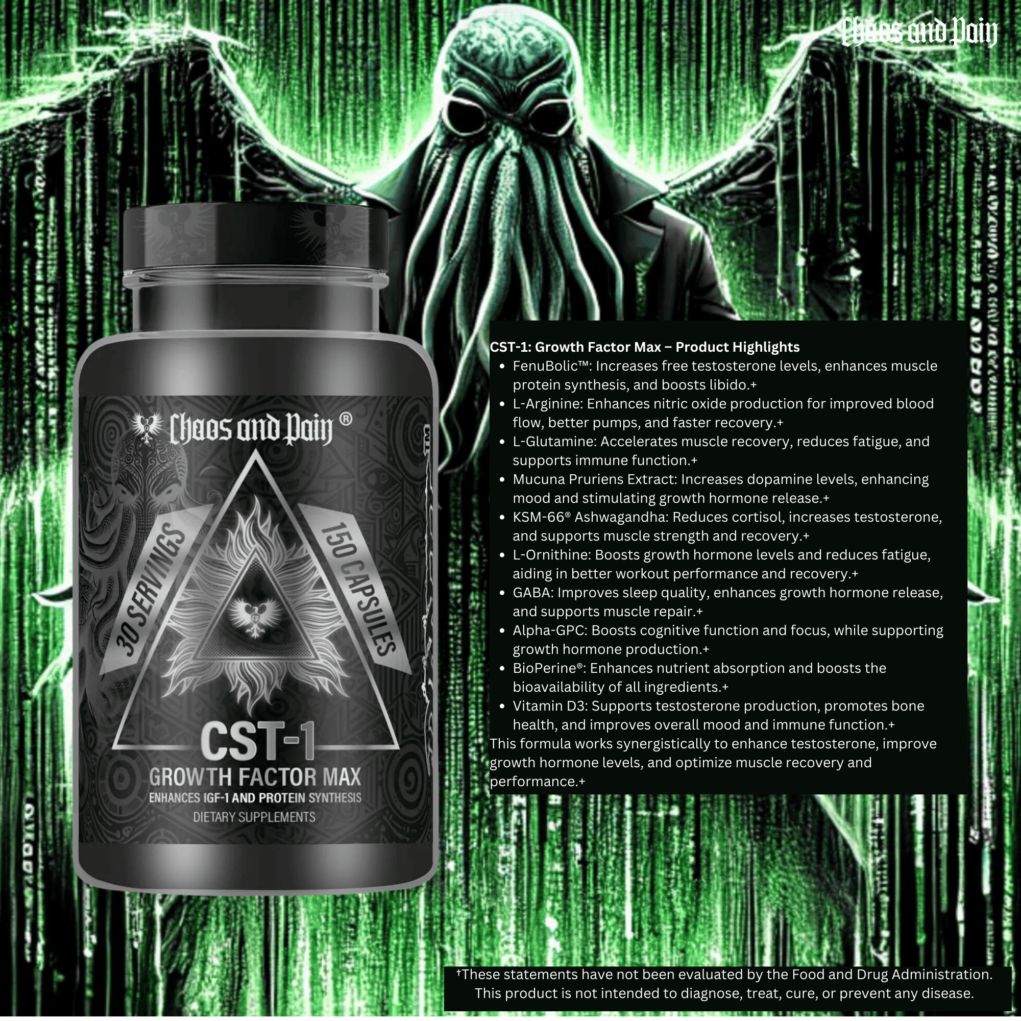 The Chaos and Pain® Testosterone and Growth Hormone Power Trio offers a comprehensive approach to boosting both testosterone and growth hormone levels naturally, delivering maximum anabolic benefits. CST-1: Growth Factor Max is packed with ingredients like FenuBolic™, KSM-66® Ashwagandha, and L-Arginine to elevate testosterone, improve muscle recovery, and promote growth hormone production. These ingredients work together to enhance muscle protein synthesis, reduce fatigue, and improve endurance, ensuring you can push harder in the gym while recovering faster. Meanwhile, the added nootropic Alpha-GPC keeps your mental focus sharp, optimizing both physical and cognitive performance during intense training.+