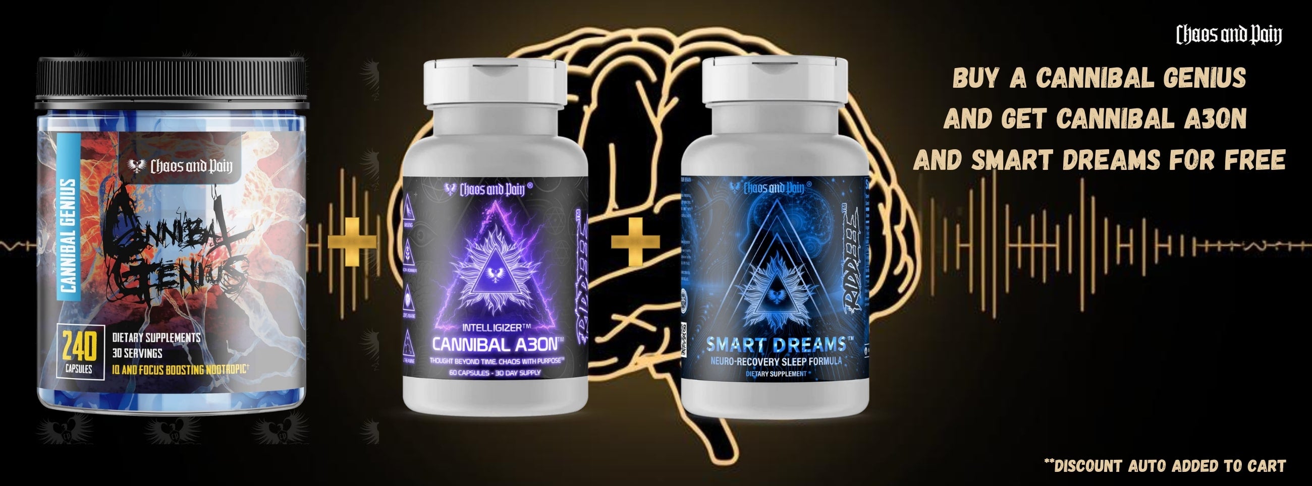 Buy our best-selling Cannibal Genius and Get a FREE Cannibal A3ON AND a FREE Smart Dreams...This is an unbelievable Nootropics Bundle. Simply add Cannibal Genius to cart and let the magic happen.
